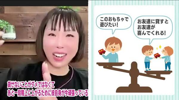 それが3歳ぐらいになってくると、「このオモチャで遊びたい」という自分の気持ちと、「お友達に貸すとお友達が喜んでくれる」という喜び、この両方を天秤にかけるようになります。