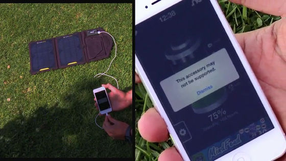 充電中のソーラーチャージャーの上に太陽光を遮って影を作ると、iPhoneのディスプレイに「This accessory may not be supported」と表示され充電されません。