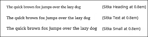 Reading View表示時にはページ中のフォントが自動的に「Sitka」フォントに変換されるようになっています。「Sitka」はウェブページが読みやすくなるように設計されており、印刷にも適しているとのこと。「文字の間隔」「文字サイズ」「x(エックス)ハイト」を考慮しており、例えば下記画像のように、同じ2.0emのサイズであっても使われる部分によって読みやすくなるように調整されています。