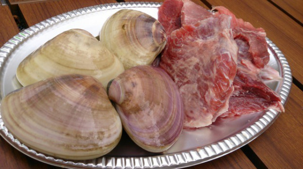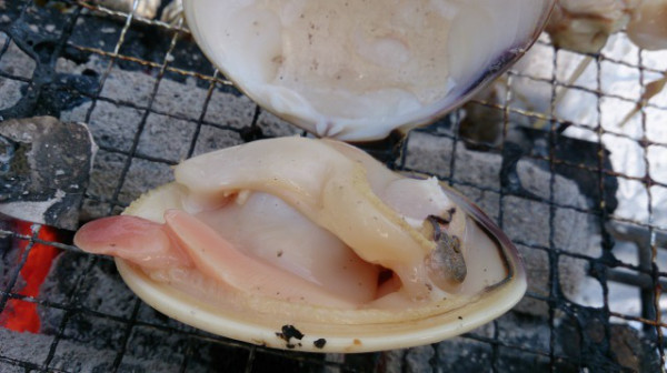 築地やま幸の天然本マグロのツラミ&大蛤。前回は醤油でもかけて焼いたけど、