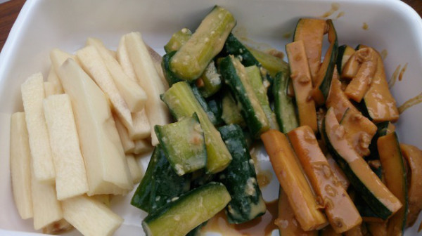 箸休め、野郎飯流・野菜漬け3種(左から、京都澤井醤油のうすくちと真っ当な国産レモンで漬け込んだ山芋、自家製にんにく味噌とヨーグルトを合わせて漬け込んだきゅうり、味噌1:ヨーグルト2で合わせて漬け込んだズッキーニ)