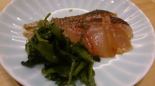 食べ進めたところで、途中でヅケになった白身魚が出てきて。これと一緒に食べるんだけど、さらに・・・