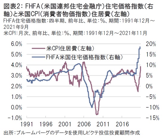 FHFA(米国連邦住宅金融庁)米国住宅価格指数と米国CPIの住居費を比較すると、住宅価格の上昇に遅行するかたちで家賃が上昇する傾向が見て取れる。局面によって遅行の程度(ズレ)はまちまちだが、約12ヵ月~18ヵ月前後といったところだろう。このFHFA米国住宅価格指数は2021年9月時点で前年比18.5%も上昇しているため、住宅を購入することが困難になった個人が賃貸市場に流入するかたちで、今後は住居費(家賃)が遅れて上昇することが想定される。
