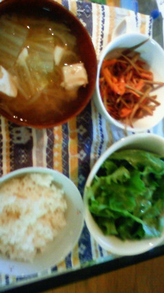 今日の献立はきんぴらごぼうと白菜と豆腐の味噌汁あゆが出勤前に作っていってくれたよあゆはピーラーを使っているのに皮の削りのこしが多々ある特ににんじんは目に見えないそうだ今日もじゅりがやってきて二人でチョコレートフォンデュをした。あゆはまだ帰ってこないアフターだろうかおやすみなさい