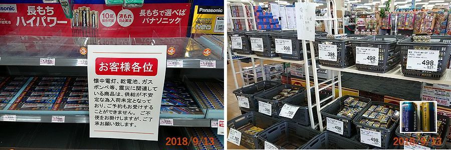 いつも電池を置いてある場所は空っぽ。何か災害時に役に立つものは無いかと売り場を30分くらい巡り歩き、帰ろうと出口に向かったら、たった今電池が入荷したようです。