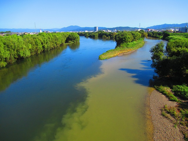 羽束師大橋を渡ります。左が桂川で右が賀茂川です。賀茂川はかなり濁っています。