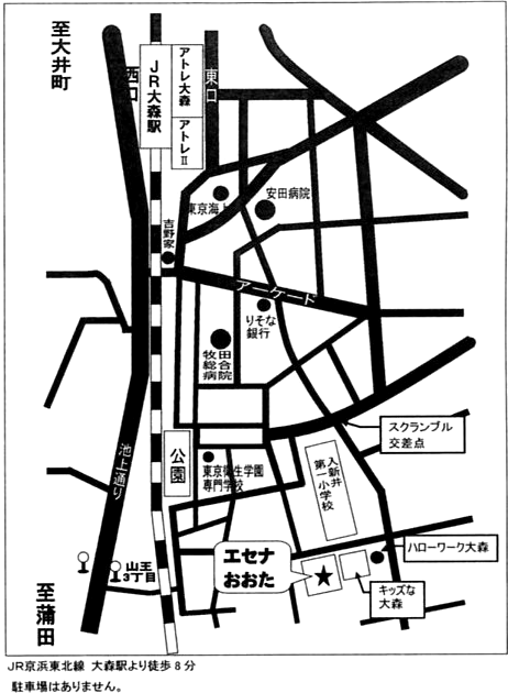 地図 エセナおおたまでの道順JR大森駅東口 徒歩8分表口と裏に駐輪場あります↓こちらのページに道順が書いてあります大田区男女平等推進センターエセナおおた 2F和室〒143-0016大田区大森北4丁目16-403-3776-4586(場所の問い合わせのみおかけください)*ヨガレッスンについてのお問い合わせご予約はコチラのBlogからお願いいたします
