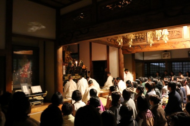 最後の出演者8名と来場者160名による本堂での祈り合わせ。