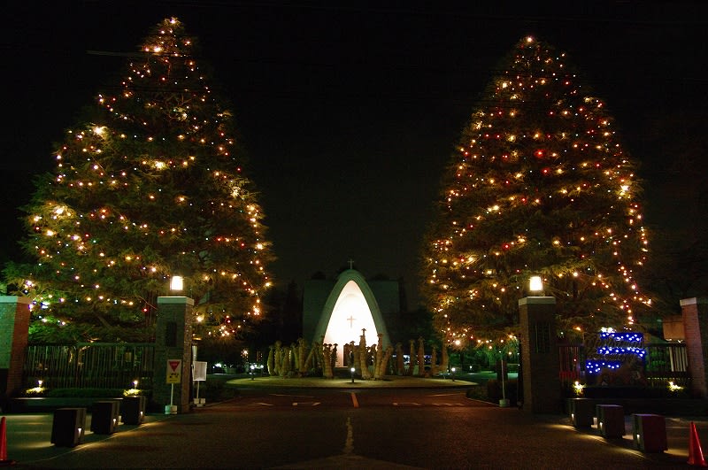 12月になると、校門を入ってすぐの大きな木にイルミネーションが点灯されます。
