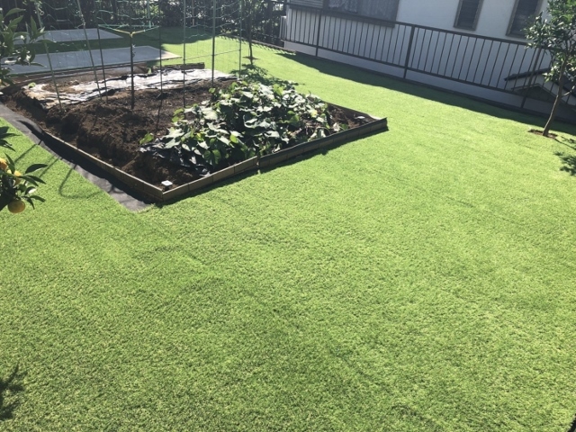 最近、人工芝の依頼がとても多いです。お庭にウッドデッキと植栽スペースである花壇を設置し、残りの隙間を人工芝へ。