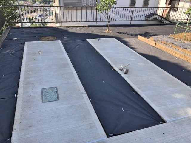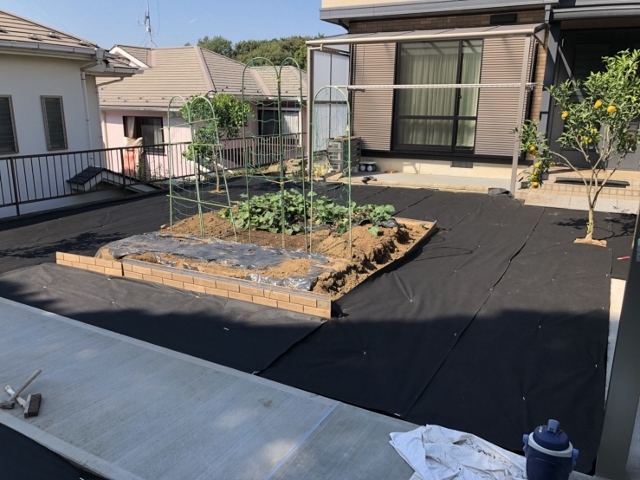 整地を転圧し、防草シートを敷きます。
