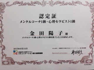 ↑ メンタルコーチ1級・心理セラピスト1級の認定を受けました。