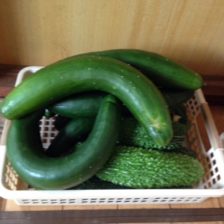 ↑ 裏庭のキュウリとゴーヤが育ち過ぎて、こんなことに。(笑)