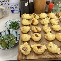 明石焼きはまな板に乗って出てきて、お出汁でいただくのよ。『当店の薬味は三つ葉です』という札が立ててありました。本場明石では明石焼きでなく『玉子焼き』と言うそうな。その名前がうなづける上品なお味です。