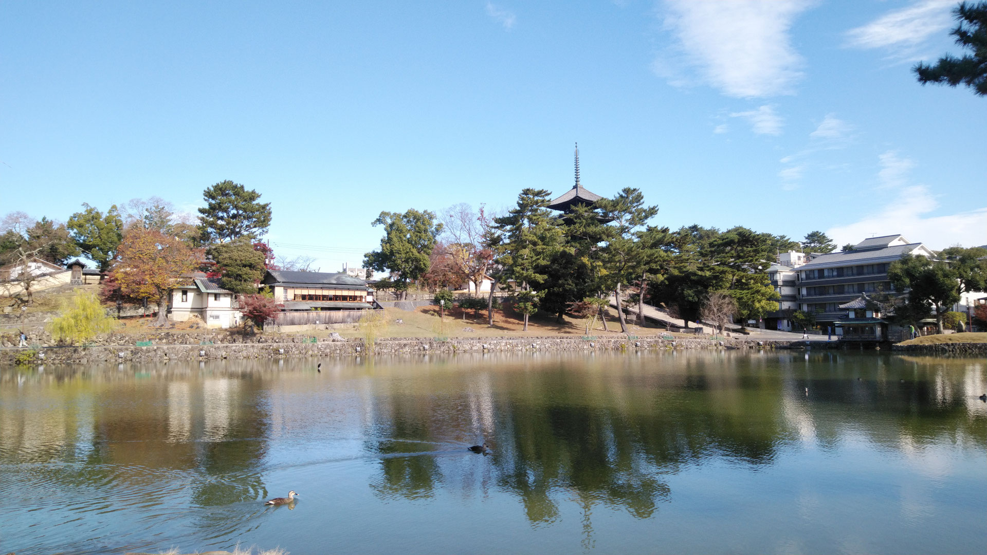 今日は珍しく猿沢池(さるさわいけ)の東側を歩きました。池に映る西側のスタバ(建物の1階)は今回パスだけど、テラスが素敵なお店なのよ💛(去年9月に行きました)。奈良は大阪より最低気温が低いけど、健気な紅葉たちはまだ落ちずにいてくれたようね。いいお天気で暖かな池端は心が和みます(^o^)