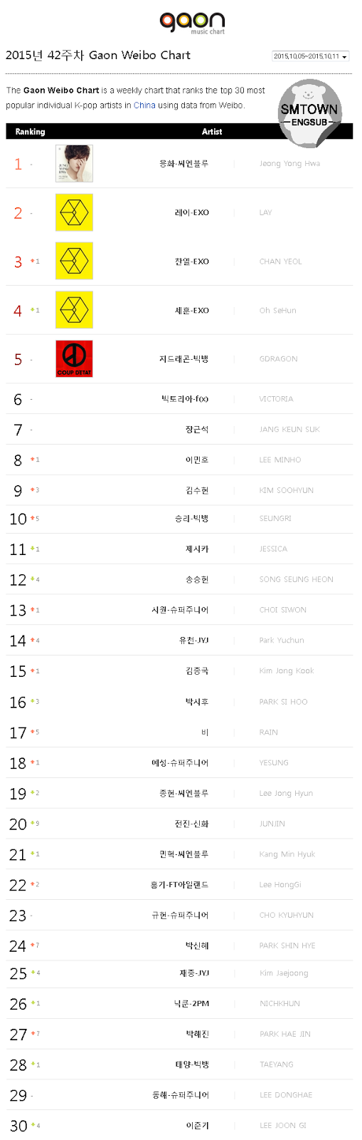 ガオンウェイボチャート1位ヨンファ&24位パクシネガオンウェイボチャート10月第2週、ヨンファ1位です\(^-^)/シネちゃんが24位です。 ジョンヒョンが19位、ミニョクが21位にも入ってます。他に7位グンソク、8位イ・ミンホ、9位キム・スヒョン、22位ホンギ。