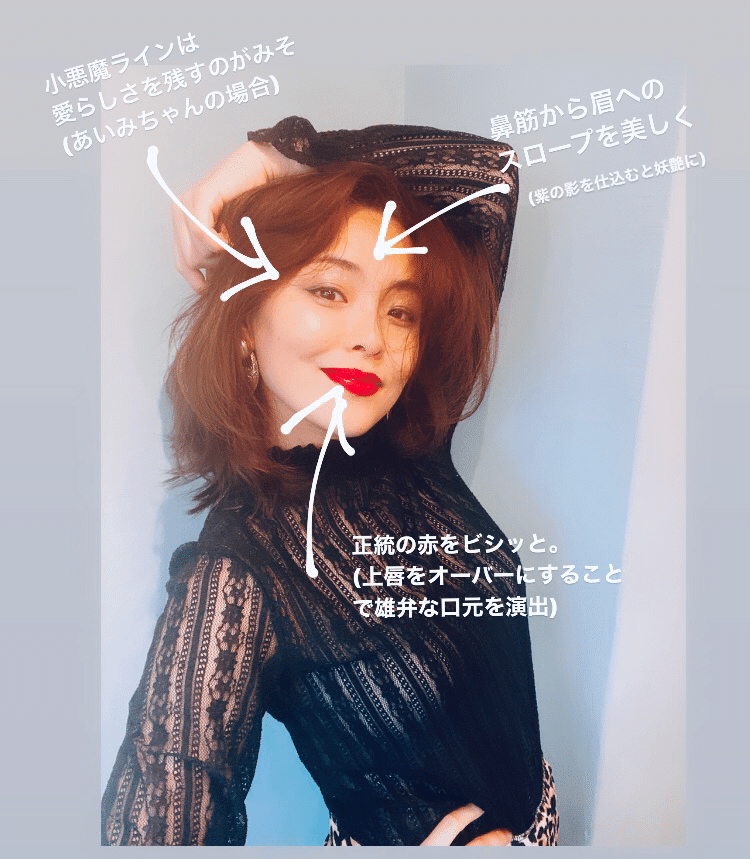 色はもちろん、上唇をオーバーリップ&下唇に丸みをもたせて曲線美を大切に描くこと。