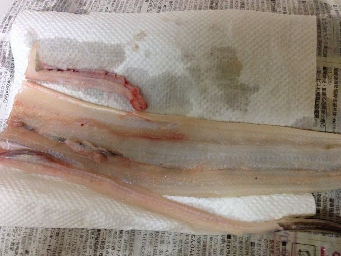 ガッチリ固定出来たらヒレ付近から腹開きにして背骨を表、裏と切れ目を入れて