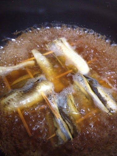 鍋にしょうゆ、酒、みりん、砂糖、水、を入れて火にかけ、サッと沸騰したら白焼きにしたアナゴ投入。