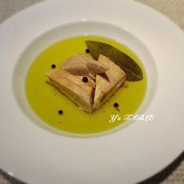 ②鍋にマグロ・つぶしたにんにく・ローリエ・ローズマリー・ブラックペッパーを入れてマグロがひたひたになるまでオリーブオイルを注ぐ