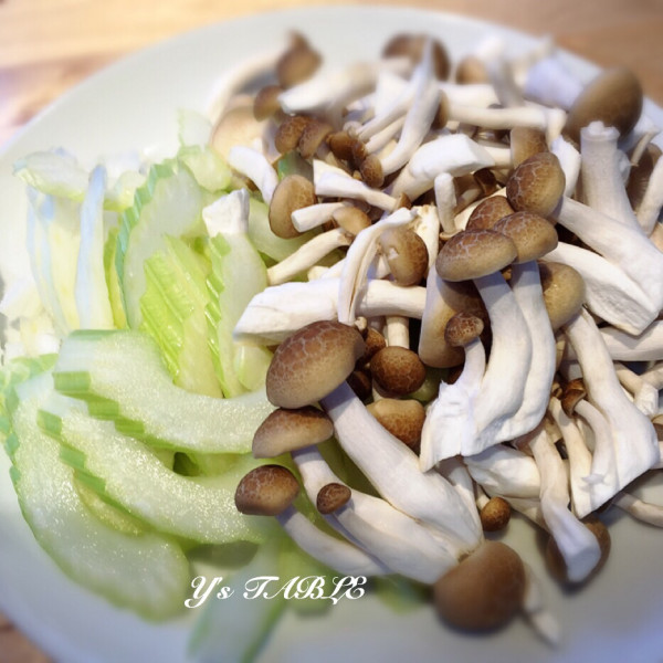 ➅オリーブオイルを少々足して、➂の生姜と赤唐辛子を入れ香りが出たら➀のきのこと➁のセロリを入れ軽く塩と胡椒で味を整えたら、➄のブリを戻し入れ@の調味料を入れサッと炒めたら出来上がり