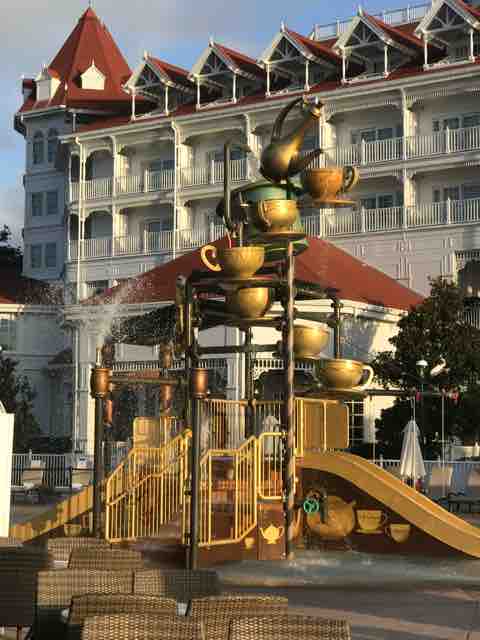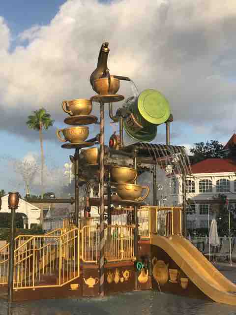 可愛いプールに素敵なティーセットがありました。ティーポットからマットハッターの大きな帽子に水が注がれます。一杯になると鐘が鳴り、ダイナミックに帽子がひっくり返ります。勢いある水の放出は、なんだか気持ちよく、スッキリします。飽きずに何度も見入ってしまいました。