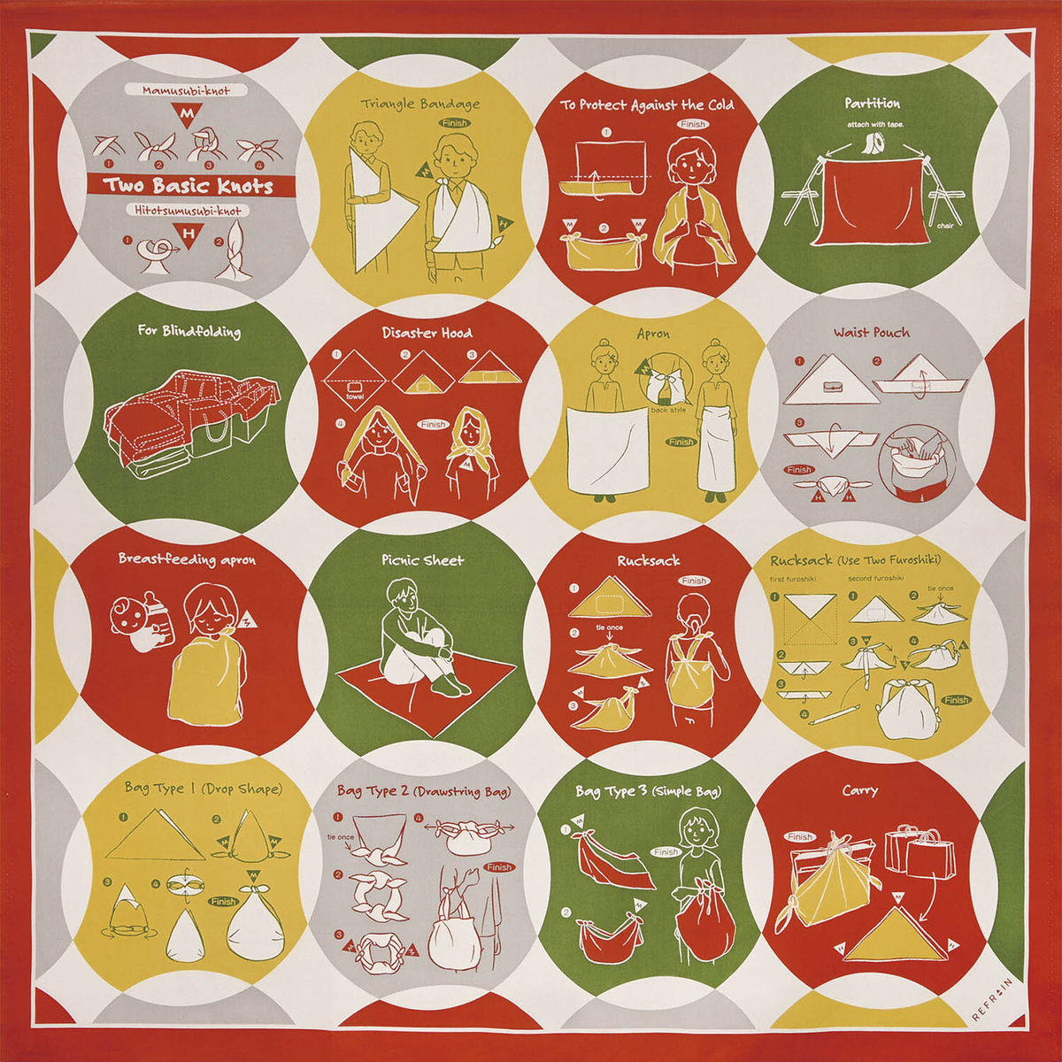 その中でもおすすめは、風呂敷そのものにいざという時の風呂敷の使い方が描かれている風呂敷です。