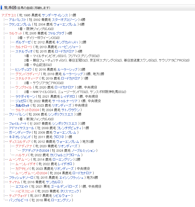 半姉には桜花賞1着のステレンボッシュがいます。母ブルークランズは中央3勝、芝中距離で活躍しました。母の姉ロカはドゥラドーレスやレガレイラを輩出しています。