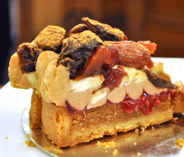 クレーム・ショコラ、チーズ、赤ワインとラム酒に漬け込んだドライフルーツと