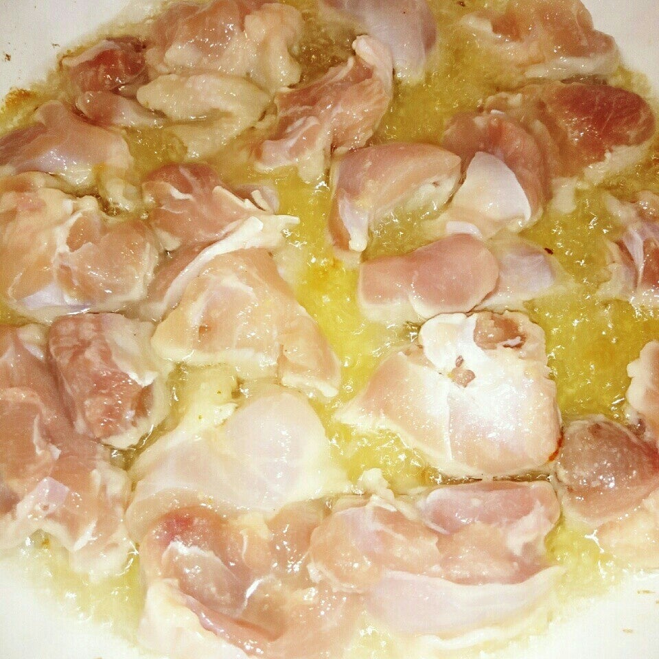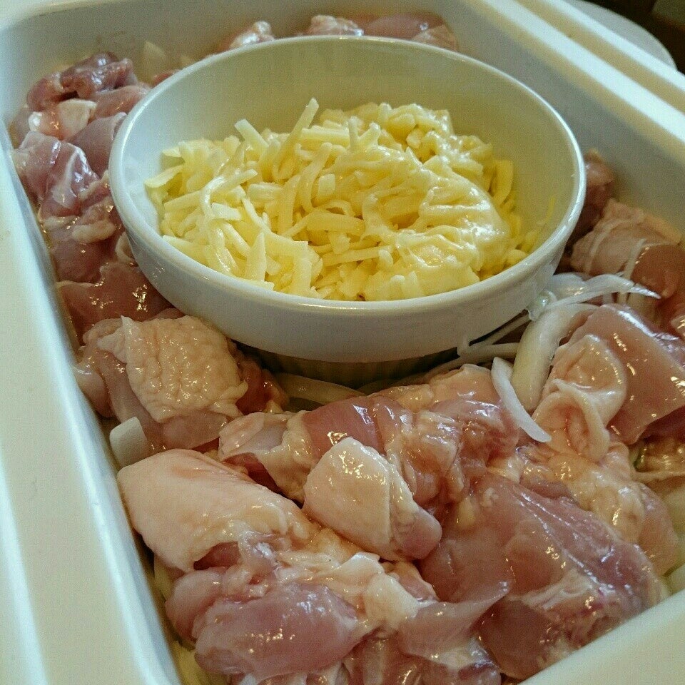 04新玉ねぎを敷き詰めた上に鶏肉を入れ炒めますよ~火が通ったらお好みの野菜をトッピングしますよ~