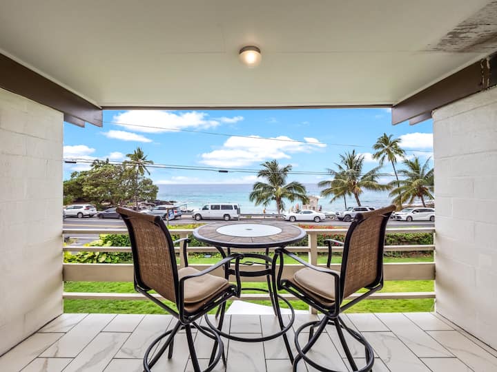 コナで人気の白砂のマジックサンドビーチの真ん前に立つ2階建のコンドの一室。