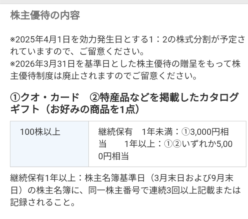 残念ながら、優待は2026年に廃止が発表されてますが、分割もされる予定だし高配当が続きそうなのでホールドしておいてよさそうだなと思っています。