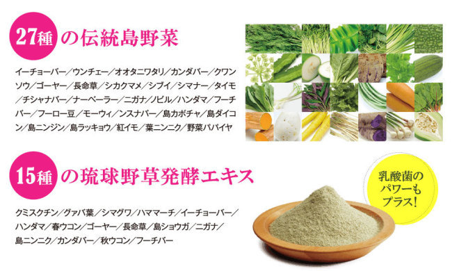 モリンガ末、大豆タンパク、難消化性デキストリン、ブドウ糖、シークヮーサー果汁末、大麦若葉末、デキストリン、ドロマイト、フラクトオリゴ糖、グルコマンナン、混合野菜末、植物発酵エキス末/加工デンプン、トレハロース、クレン酸、増粘多糖類、香料、ビタミンC、ピロリン酸第二鉄、甘味料(アスパルテーム、L-フェニルアラニン化合物、ステビア)、ビタミンE、ナイアシン、パントテン酸カルシウム、ビタミンB1、ビタミンA、ビタミンB6、ビタミンB2、香辛料抽出物、葉酸、ビタミンD、ビタミンB12