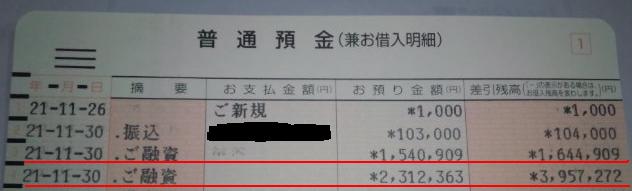銀行へ出向き、審査には3週間程(年末事情や中小企業の年末の資金繰り難対策のため時間がかかりましたが通常はもっと早いかもしれません)かかりましたが、特に指摘されることはなく、1発で審査は通り、400万円の融資が実行されました。