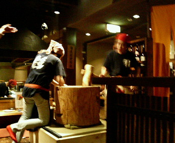 突然、お店の真ん中にある臼でもちをつき始めたのです。