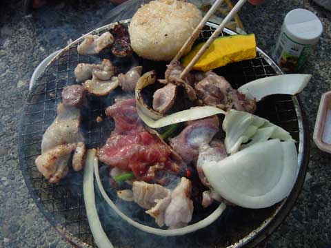 石狩で焼肉今日も、相変わらず暑かったです。 15:00頃から石狩に行ってきました。 石狩に行く途中にカウボーイがあるので そこで肉・飲み物(ビール)を買って行きました。 いつもなら、カルビ、鶏肉、ホルモンといった感じなのですが 今日は、砂肝も買ってみました。 砂肝は塩・コショウで焼いて食べたんですが なかなか美味しかったです。 網の上は色々なものが乗っててゴチャゴチャですが 写真を撮ってみました。 写真の上のほうの白い丸いのは焼きおにぎりです。