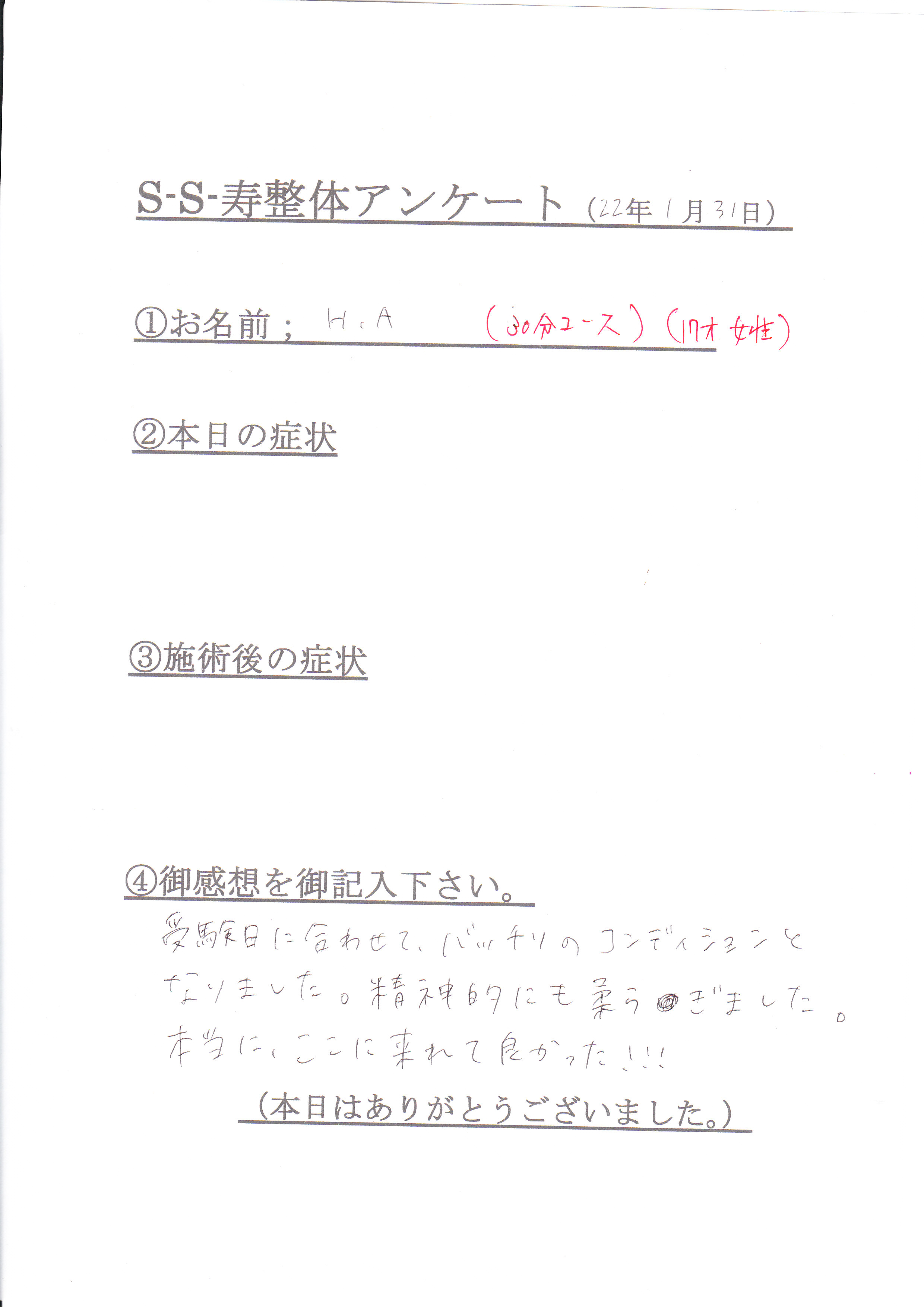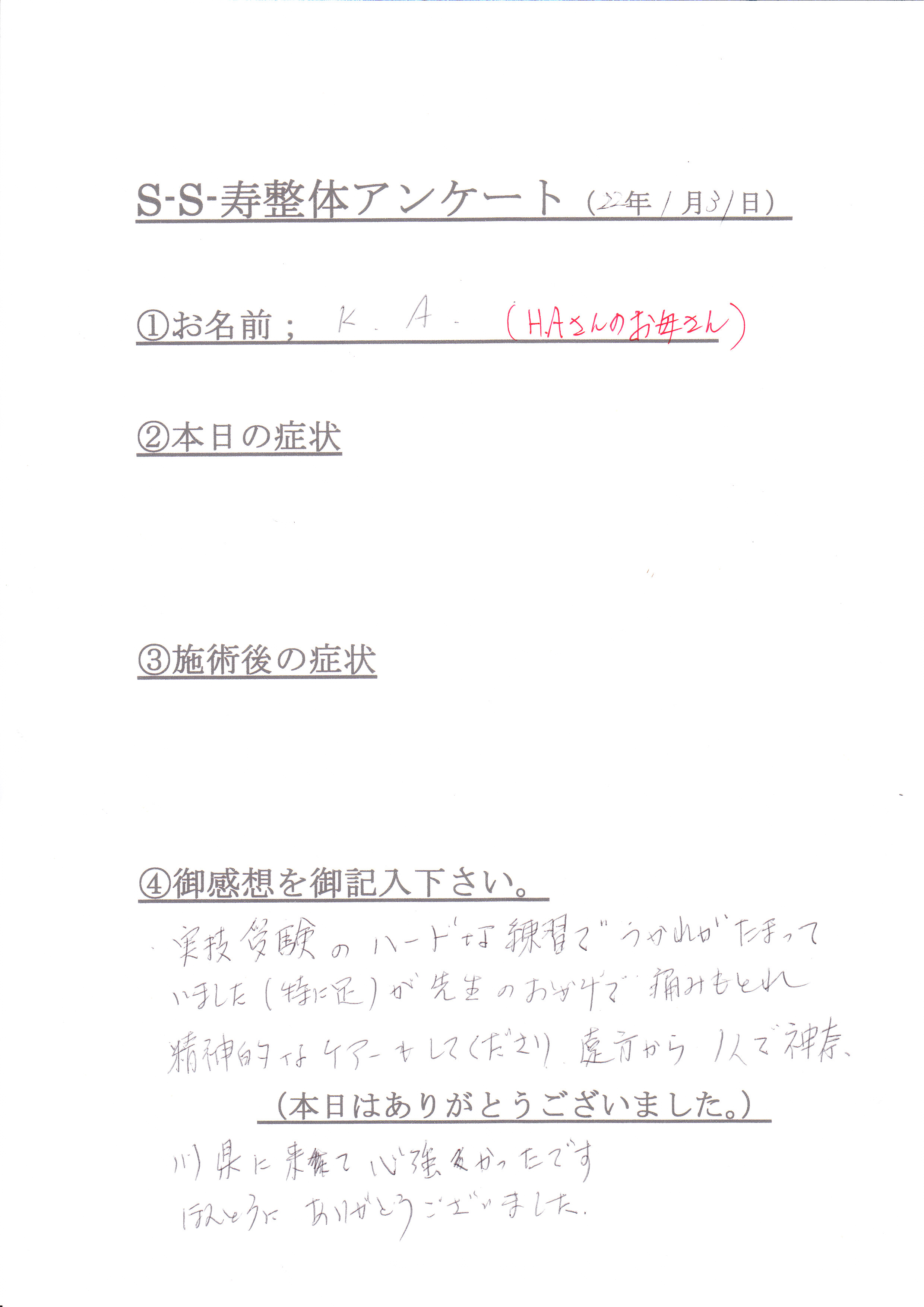 この一月間で7~8回の整体療術ですっかり筋肉の柔軟性を取り戻しAさん、何と直前の模試では500人以上の中で見事にトップの成績を修められたとの事。(拍手!)その話を聞き、私も正直驚いたのととてもうれしかったですね。