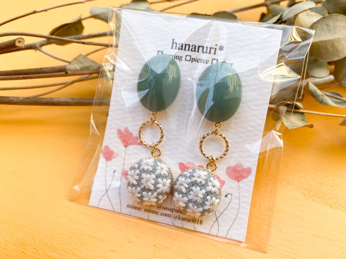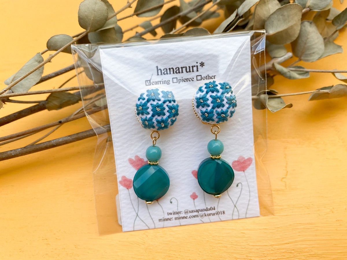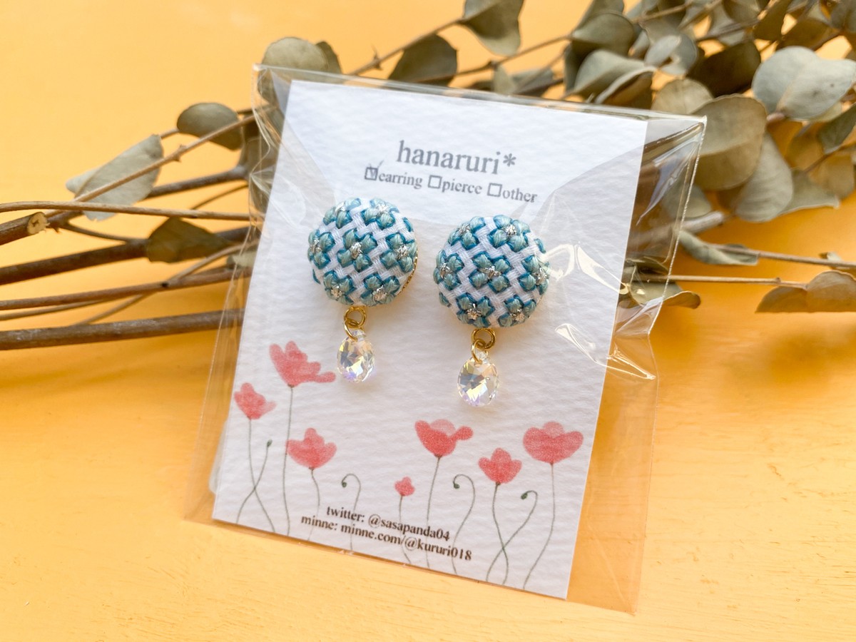 淡いブルーのクロスステッチのお花柄のイヤリング