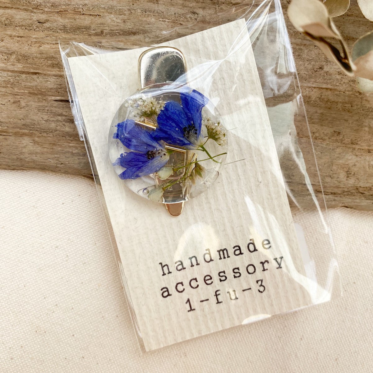 ブルーデルフィニウムと白いお花がきれいなヘアゴム