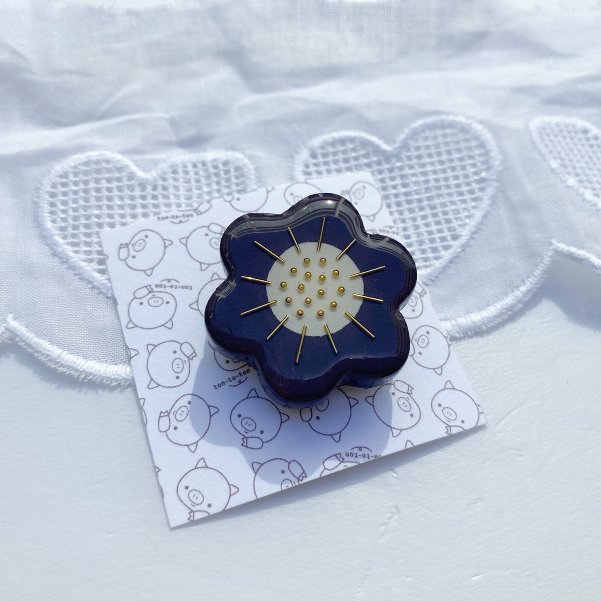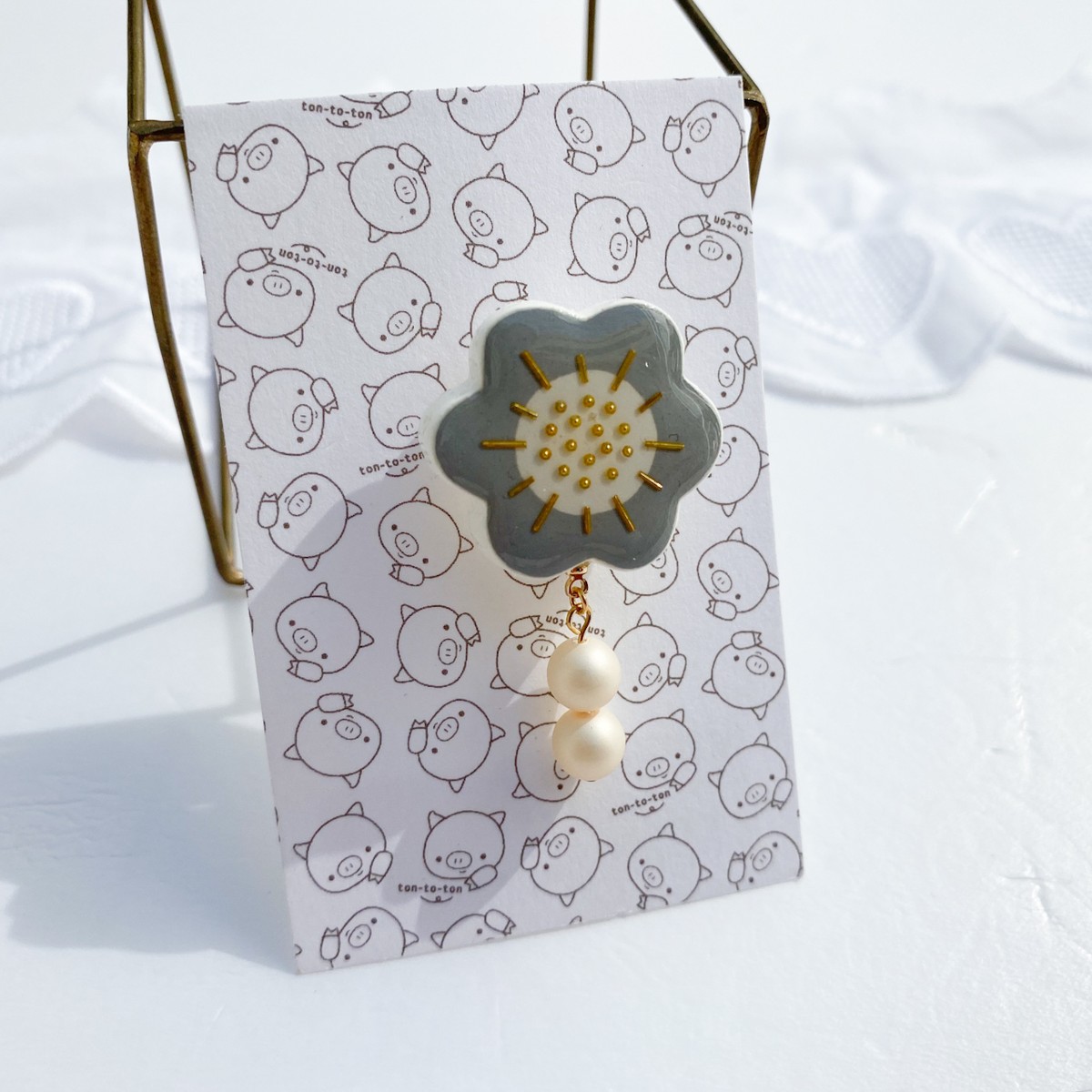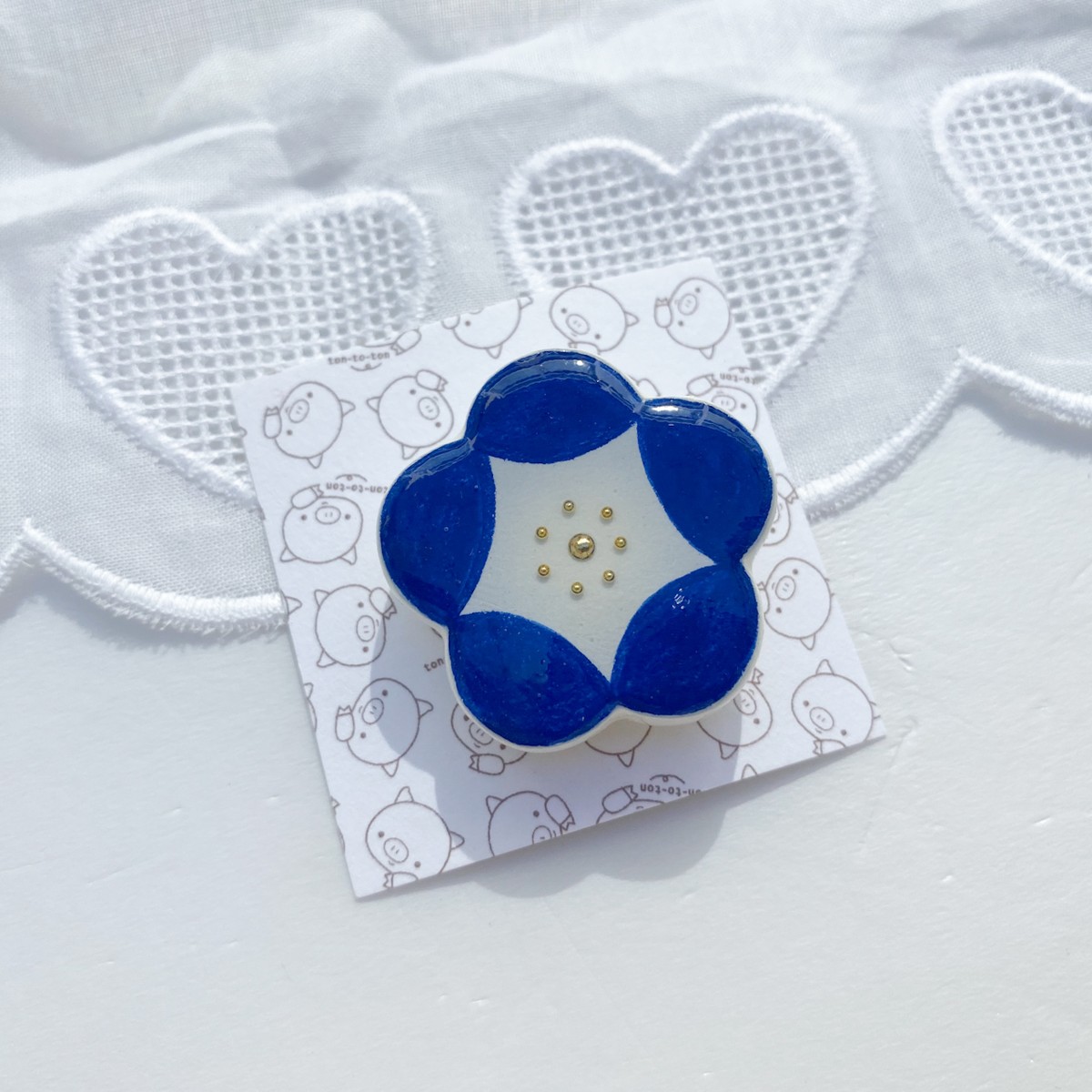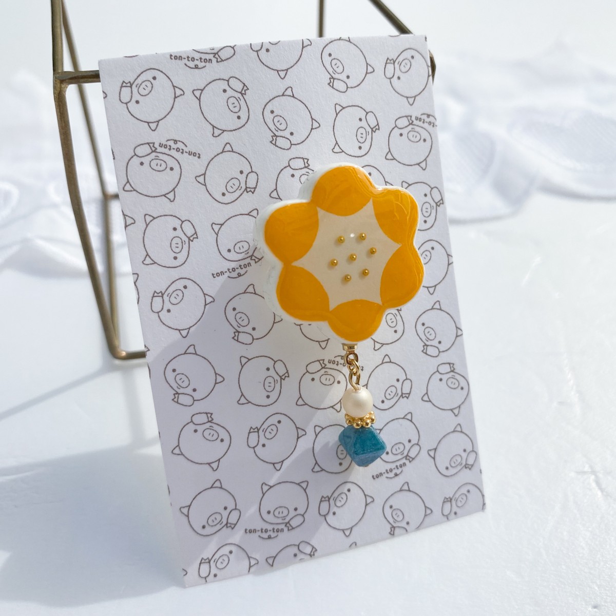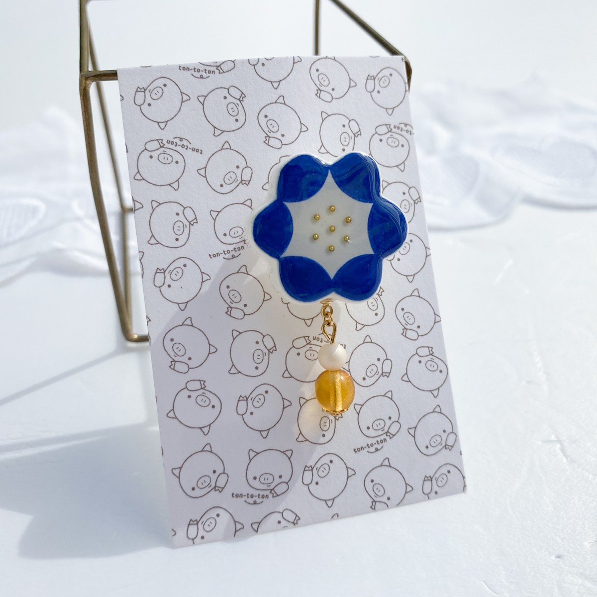 きれいなブルーのお花と黄色のビーズが揺れるブローチ