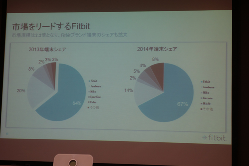 米国では活動量計の分野で2013年に64%、2014年に67%とシェアを伸ばしているという同社。自身を運動不足と認識している人が多く、腕時計・リストバンド型のウェアラブル端末の市場の伸びが予想される日本市場に新製品を投入し、アプリで管理する食品データベースにも10万件以上の日本食のデータベースを追加して日本でもシェア拡大を狙います。