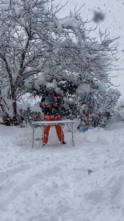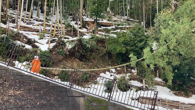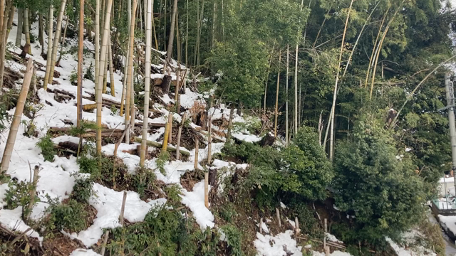 雪便り2日目○ 竹5本と格闘する和尚