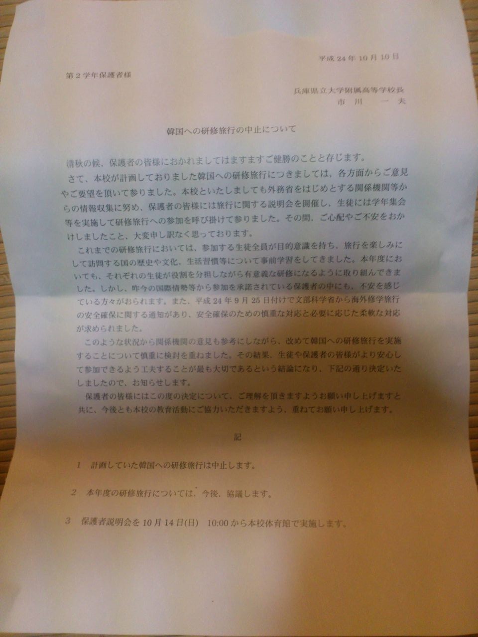 ▽学校側が韓国への修学旅行の中止を決定した通知(10月10日)▽