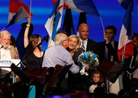 写真=フランス南部マルセイユで9月に開かれた国民戦線の集会で、父親のジャンマリ・ルペン前党首(中央左)に抱擁される