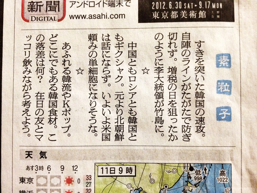 明博が竹島上陸した次の日の朝日新聞夕刊