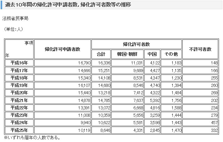 年間1万人弱の帰化する者がいる ほとんどが韓国人(朝鮮人)や中国人