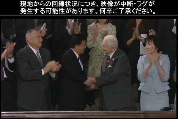 安倍首相は「硫黄島に行っている厳かな目的は、双方の戦死者を追悼し、栄誉をたたえることだ」とのスノーデン氏の言葉を引用。首相が「熾烈(しれつ)に戦い合った敵は、心の紐帯(ちゅうたい)が結ぶ友になった」と述べると、立ち上がっていたスノーデン氏と新藤氏は、出席者総立ちの拍手喝采を浴びながら握手を交わした。