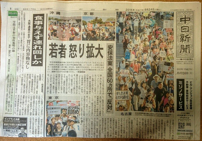 今朝の東京新聞一面。SEALDs呼びかけの昨日のデモな。