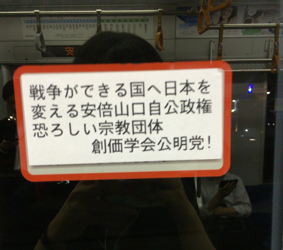 この後も口論は延々と続いていた。見たところ建設的な議論ができるタイプではないので相手にしないのが正解であろう。この一件に限らず「アベ政治を許さない」一派はどうも会話が通じない人が多くて不思議だ。電車内ではこのようなシールを貼り付ける行為が横行している。