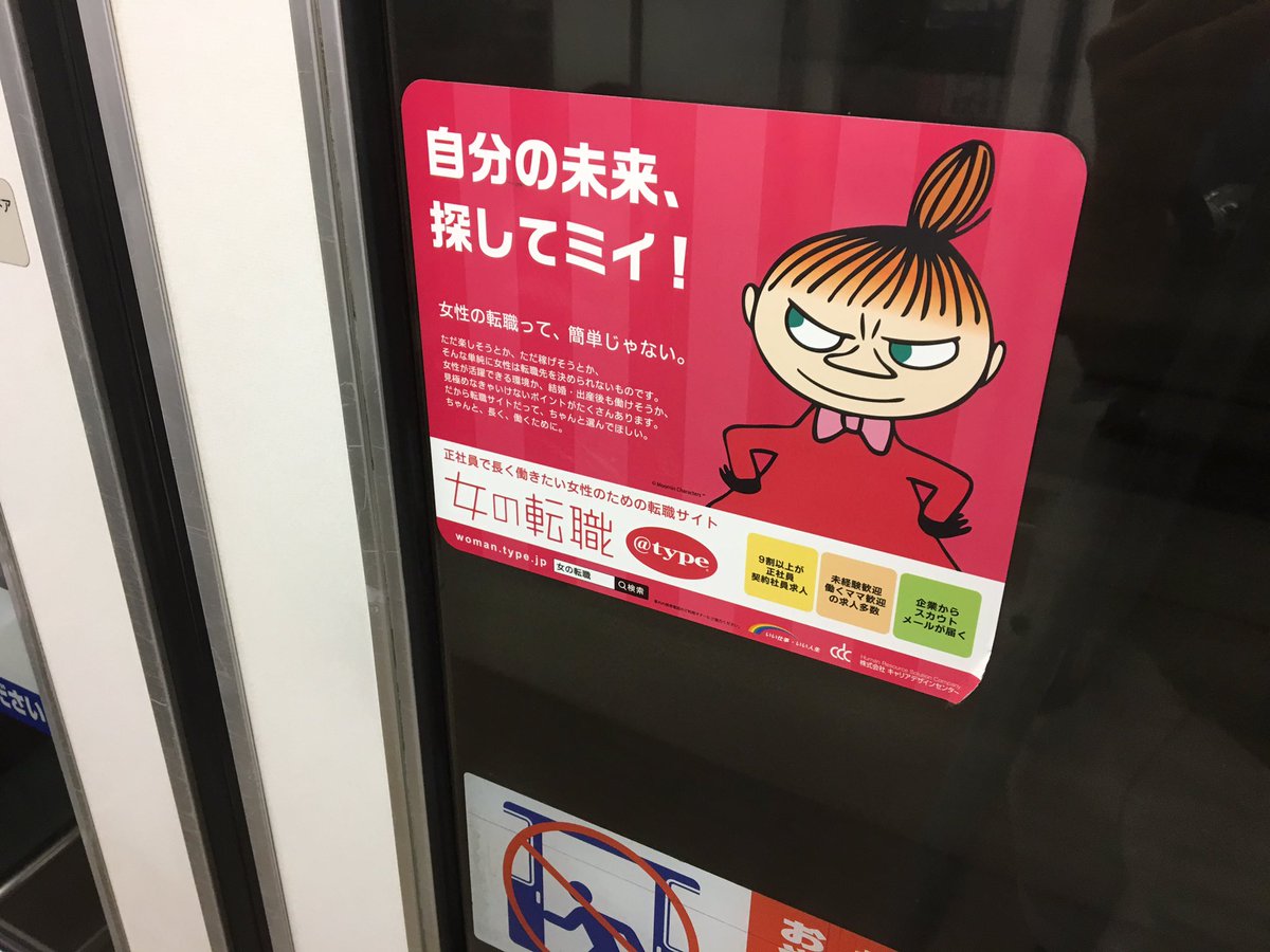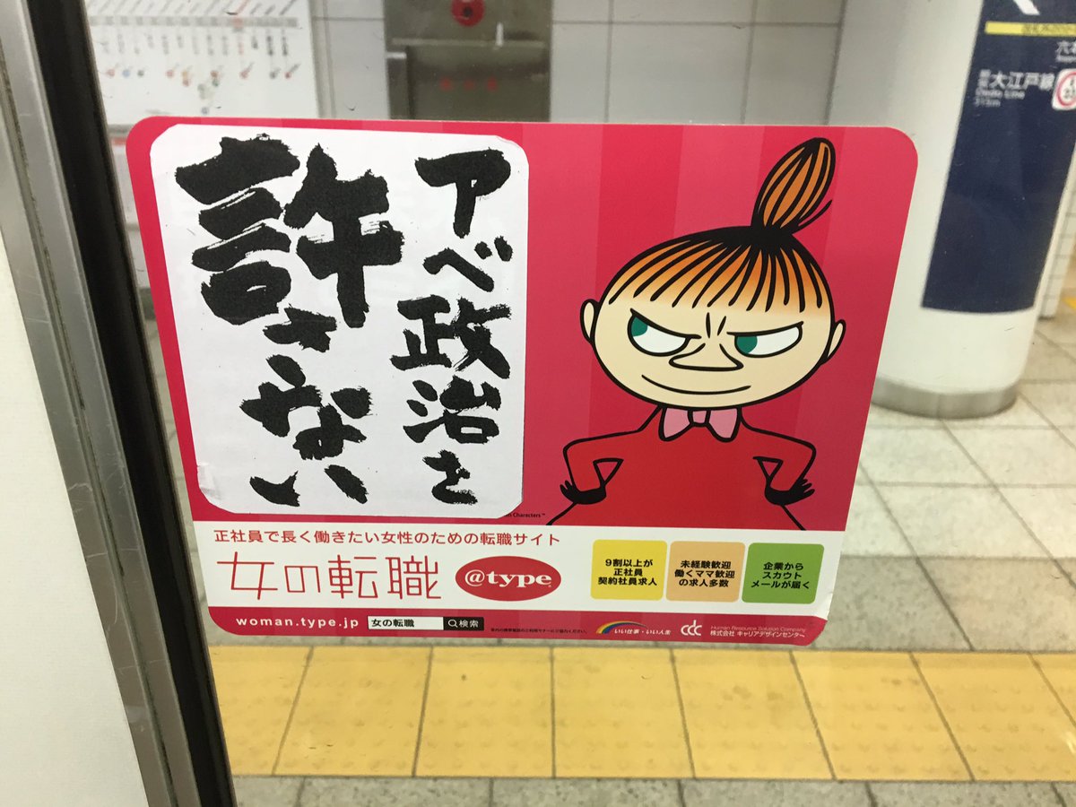 ▼あたかもはじめからこういうデザインだったように見えるが、「アベ政治を許さない」の部分は勝手に貼られたシール。もともとは転職サイト「@type」がムーミンのキャラクターを使った広告であることが分かる。